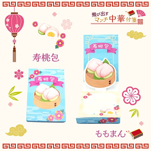 開けると桃まんが飛び出すしかけつきふせんの「中華」シリーズ。 マッチ風のパッケージを開けると、中華飯モチーフのデザインがポップアップ!使いやすい可愛いスクエア付箋30枚付き。