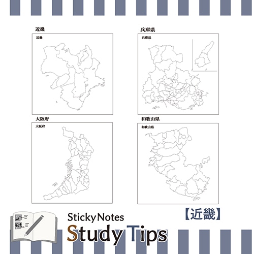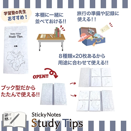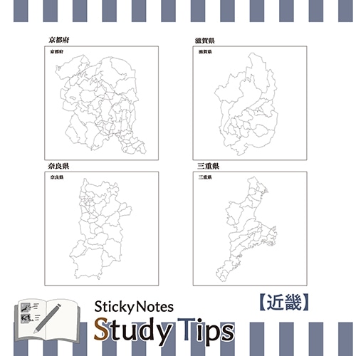 進学塾との共同開発!しっかり学べる学習付箋に近畿地方が登場。 勉強するときや旅行の記録で面倒な地図の書き写し…。そんな時間を解消するために開発された地図付箋です。