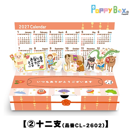 2027年カレンダー商材の中でも、“見た瞬間に違いが伝わる”差別化アイテムです。 十二支が飛び出す仕様で、売場でのアイキャッチ性が高く、従来の卓上・壁掛けカレンダーとは異なる体験価値を提供できます。