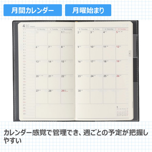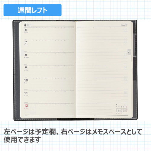 NOLTY(ノルティ)のシンプルウィークリー手帳。仕事にもプライベートにも使いやすい人気のスケジュール帳です。 【月間ページ】見開き1ヶ月のベーシックなブロックタイプ(月曜始まり)。 【週間ページ】見開き1週間のレフトタイプ(月曜始まり)。予定とメモにバランスよく使えるので、初心者にもおすすめのレイアウトです。 モデルチェンジ:・裏表紙のNOLTYのロゴマークを廃止し、より多くの人が使いやすいシンプルなデザインに変更しました。