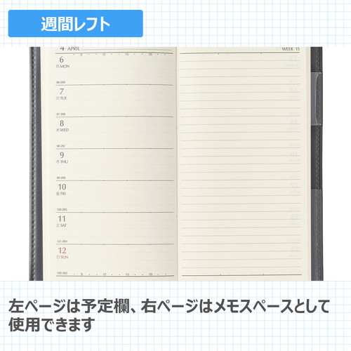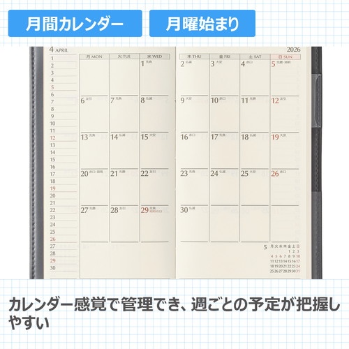 NOLTY(ノルティ)の縦長ビジネス手帳。 【月間ページ】見開き1ヶ月のベーシックなブロックタイプ(月曜始まり)。 【週間ページ】見開き1週間のレフトタイプ(月曜始まり)。予定とメモにバランスよく使えるので、初心者にもおすすめのレイアウトです。 モデルチェンジ:・裏表紙のNOLTYのロゴマークを廃止し、より多くの人が使いやすいシンプルなデザインに変更しました。 ・文字が見やすくなりました