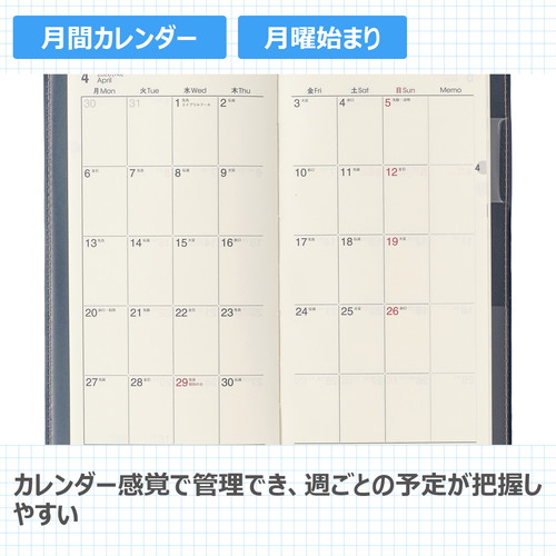 NOLTY(ノルティ)の縦長ビジネス手帳。 【月間ページ】見開き1ヶ月のベーシックなブロックタイプ(月曜始まり)。 【週間ページ】見開き1週間のレフトタイプ(月曜始まり)。予定とメモにバランスよく使えるので、初心者にもおすすめのレイアウトです。 モデルチェンジ:・裏表紙のNOLTYのロゴマークを廃止し、より多くの人が使いやすいシンプルなデザインに変更しました。 ・文字が見やすくなりました
