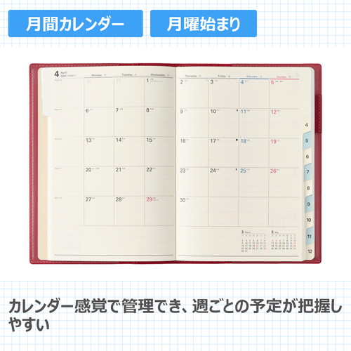 社会人にはもちろん、学生にもおすすめのウィークリーダイアリー 【月間ページ】見開き1ヶ月のベーシックなブロックタイプ(月曜始まり)。カレンダーと同じような感覚で見ることができ、週ごとの予定が把握しやすいのが特徴です。 【週間ページ】見開き1週間のメモタイプのレイアウト(月曜始まり)。1日分のスペースが広いので、日記などの記録に便利です。