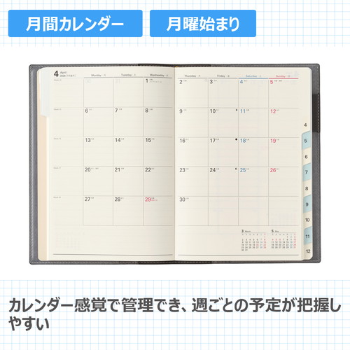 社会人にはもちろん、学生にもおすすめのウィークリーダイアリー 【月間ページ】見開き1ヶ月のベーシックなブロックタイプ(月曜始まり)。カレンダーと同じような感覚で見ることができ、週ごとの予定が把握しやすいのが特徴です。 【週間ページ】見開き1週間で、月曜~金曜を中心に時間軸を配置したバーチカルタイプ。1日に複数の予定が入る、スケジュール管理を重視したい方におすすめです。