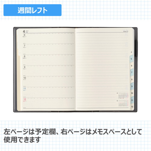 社会人にはもちろん、学生にもおすすめのウィークリーダイアリー 【月間ページ】見開き1ヶ月のベーシックなブロックタイプ(月曜始まり)。カレンダーと同じような感覚で見ることができ、週ごとの予定が把握しやすいのが特徴です。 【週間ページ】見開き1週間のレフトタイプ(月曜始まり)。予定とメモにバランスよく使えるので、初心者にもおすすめのレイアウトです。