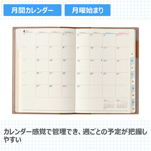 社会人にはもちろん、学生にもおすすめのウィークリーダイアリー 【月間ページ】見開き1ヶ月のベーシックなブロックタイプ(月曜始まり)。カレンダーと同じような感覚で見ることができ、週ごとの予定が把握しやすいのが特徴です。 【週間ページ】見開き1週間のレフトタイプ(月曜始まり)。予定とメモにバランスよく使えるので、初心者にもおすすめのレイアウトです。