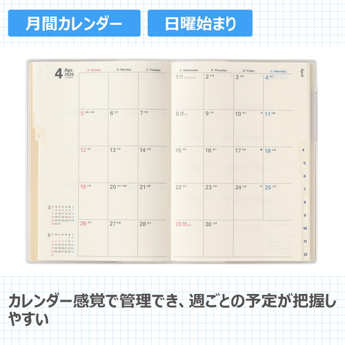 NOLTY(ノルティ)のマンスリー手帳、B6-i日曜シリーズは、薄さと軽さが人気のロングセラーシリーズ。 【月間ページ】広々書ける人気のB6サイズ(日曜始まり)。薄くて軽いので、カバンに入れて持ち運ぶのにもとっても便利。 文字が大きく、すっきりとしたデザインのレイアウトなので、ストレスなく予定を書き込めます。見たい月がすぐに検索できるインデックス付き。