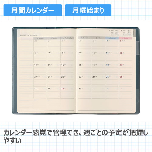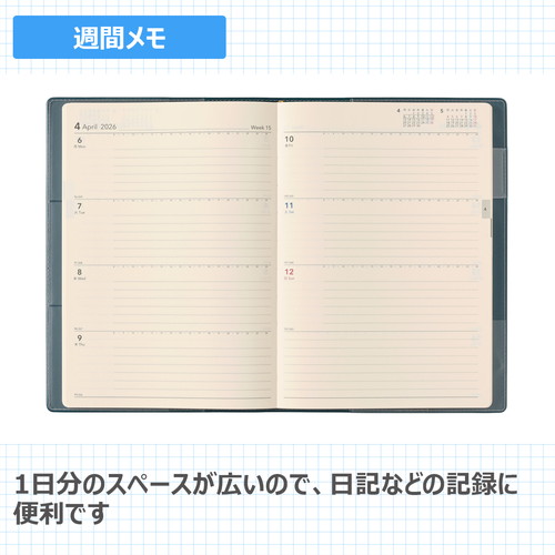 NOLTY(ノルティ)ブランド売上1位のウィークリー手帳シリーズ※日本能率協会マネジメントセンター24年度版EC販売数 メモページがノート1冊分あり、手帳とノートを一括管理したい人におすすめ。 【月間ページ】見開き1ヶ月のベーシックなブロックタイプ(月曜始まり)。カレンダーと同じような感覚で見ることができ、週ごとの予定が把握しやすいのが特徴です。 【週間ページ】見開き1週間で、左右のページに日付が分割されているメモタイプのレイアウト(月曜始まり)。1日分のスペースが広いので、日記などの記録に便利です。 モデルチェンジ:・製本を変更し開きやすくなりました