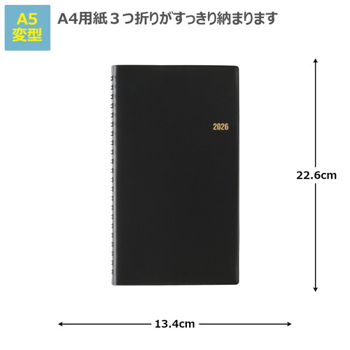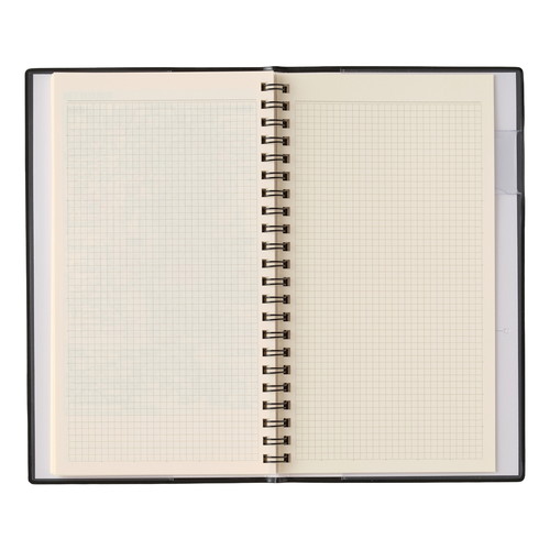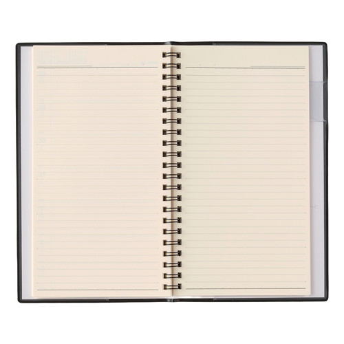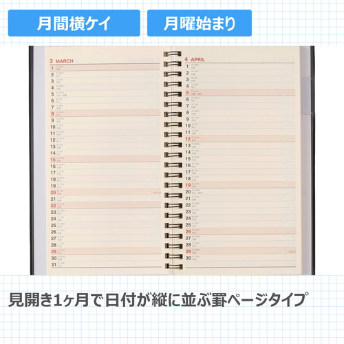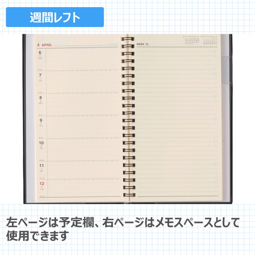 平らに開いて書きやすいNOLTY(ノルティ)のリング式ウィークリー手帳 【月間ページ】見開き2ヶ月で日付が縦に並ぶ罫ページタイプのレイアウト。長期の予定やプロジェクト管理に便利です。 【週間ページ】見開き1週間のレフトタイプ(月曜始まり)。予定とメモにバランスの良い手帳です。