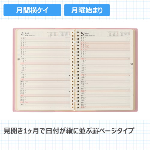 平らに開いて書きやすいNOLTY(ノルティ)のリング式ウィークリー手帳 【月間ページ】見開き2ヶ月で日付が縦に並ぶ罫ページタイプのレイアウト。長期の予定やプロジェクト管理に便利です。 【週間ページ】見開き1週間のレフトタイプ(月曜始まり)。予定とメモにバランスの良い手帳です。