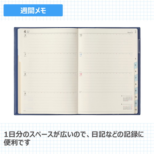 月間と週間が連続したページ構成で、月ごとにまとめて予定を組むのに適しているNOLTY(ノルティ)人気のウィークリー手帳。 【月間ページ】見開き1ヶ月のベーシックなブロックタイプ(月曜始まり)。カレンダーと同じような感覚で見ることができ、週ごとの予定が把握しやすいのが特徴です。 【週間ページ】見開き1週間で、左右のページに日付が分割されているメモタイプのレイアウト(月曜始まり)。1日分のスペースが広いので、日記などの記録に便利です。 モデルチェンジ:・製本を変更し開きやすくなりました
