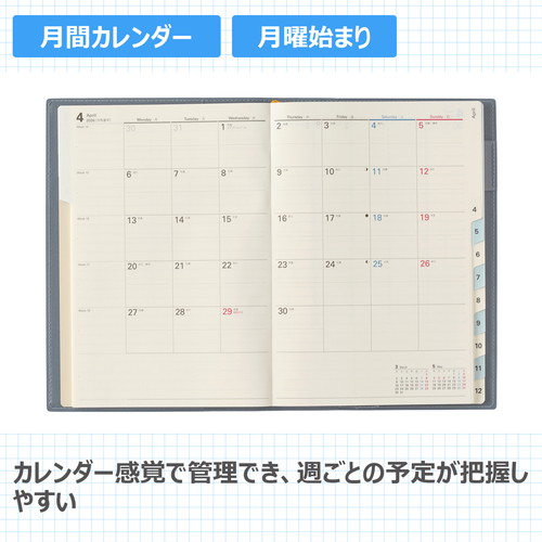 月間と週間が連続したページ構成で、月ごとにまとめて予定を組むのに適しているNOLTY(ノルティ)人気のウィークリー手帳。 【月間ページ】見開き1ヶ月のベーシックなブロックタイプ(月曜始まり)。カレンダーと同じような感覚で見ることができ、週ごとの予定が把握しやすいのが特徴です。 【週間ページ】見開き1週間で全面に時間軸を配置したバーチカルタイプにメモスペースも確保した充実のレイアウト。細かなスケジュール管理に加え、その週のメモも取りたいという方におすすめです。 モデルチェンジ:・製本を変更し開きやすくなりました