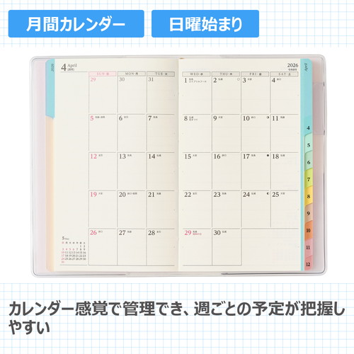 カラフルなインデックスが人気のPAGEM by NOLTY(ペイジェム バイノルティ)のウィークリー手帳シリーズ。 【月間ページ】見たいページがパッと開けるインデックス付き(日曜始まり)。 【週間ページ】見開き1週間で、左に予定、右にメモが書けるレフトタイプ。予定とメモにバランスよく使えるので、初心者にもおすすめのレイアウトです。 ※表紙を変更しました