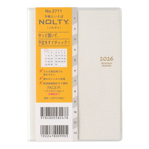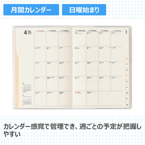 PAGEM by NOLTY(ペイジェム バイノルティ)のマンスリー手帳A6-iシリーズは、1ヵ月の予定をパッと見渡すことができ、持ち運びの際にもかさばらないサイズが特長です。 【月間ページ】見開き1ヵ月のベーシックなブロックタイプ(日曜始まり)。カレンダー感覚で月ごとの予定が把握しやすく、見たいページをパッと開けるインデックス付きです。