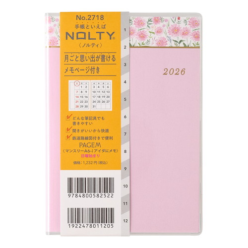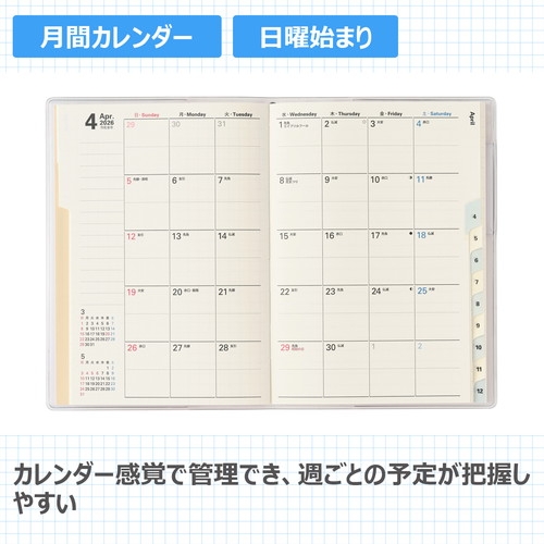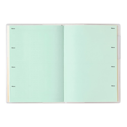 PAGEM by NOLTY(ペイジェム バイノルティ)のマンスリー手帳、A6-iアイダにメモシリーズは、各月のアイダにメモページと方眼ページが2ページずつ付いているのが特長です。 【月間ページ】持ち運びにも便利なA6サイズ(日曜始まり)。すっきりとしたデザインのレイアウトで、ストレスなく書き込めます。1日のマスを上下に二分割しているので「午前/午後」「自分/家族」など予定を整理して記入できます。 ※表紙を変更しました