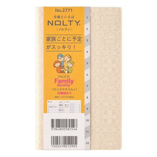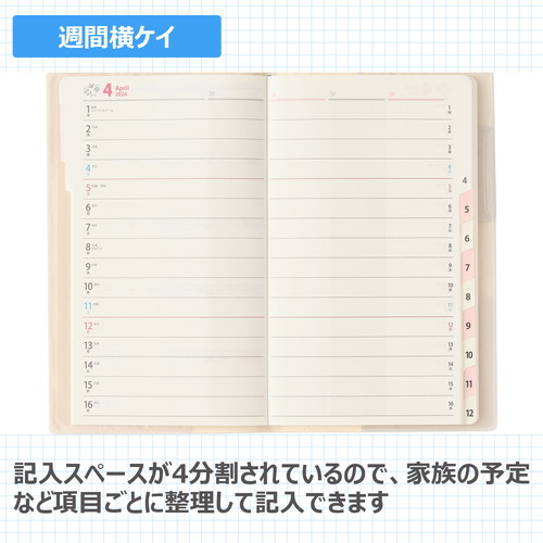 PAGEM by NOLTY(ペイジェム バイノルティ)のファミリーマンスリーは、巻末に「防災チェックリスト」や「贈答のマナー」など、生活に役立つ資料がついている便利な手帳です。 【月間ページ】見開き1ヵ月のブロックタイプ(日曜始まり)。カレンダー感覚で月ごとの予定が把握しやすく、見たいページをパッと開けるインデックス付き。 【週間ページ】見開き2週間で日付が縦に並ぶ罫ページタイプのレイアウト。記入スペースが5分割されているので、家族の予定など項目ごとに見やすく整理して記入できるのが特長です。 ※表紙を変更しました
