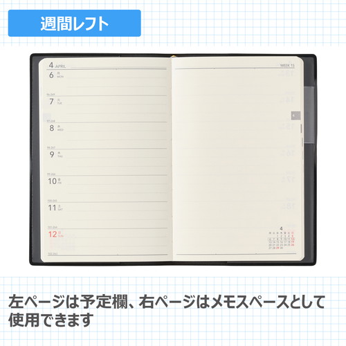 NOLTY(ノルティ)の長年愛されるビジネス手帳 【月間ページ】日付が縦に並ぶ罫ページタイプのレイアウト。長期の予定やプロジェクト管理に便利です。 【週間ページ】見開き1週間で左ページに予定、右ページはメモスペースとして使えるレフトタイプ(月曜始まり)。予定とメモにバランスの良い手帳です。 モデルチェンジ:・裏表紙のNOLTYのロゴマークを廃止し、より多くの人が使いやすいシンプルなデザインに変更しました。