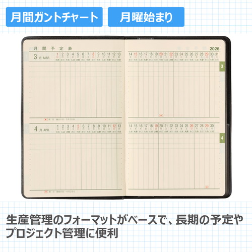 手帳に初めて「時間目盛」を採用した、70年以上の歴史を誇るビジネス手帳の決定版。1つ1つ丁寧に職人の手によって生み出される手帳は多くのファンに愛されています。 【月間ページ】生産管理のフォーマットがベースのガントチャートタイプ。長期の予定やプロジェクト管理にも便利です。 【週間ページ】見開き1週間で左ページに予定、右ページはメモスペースとして使えるレフトタイプ(月曜始まり)。予定とメモにバランスの良い手帳です。