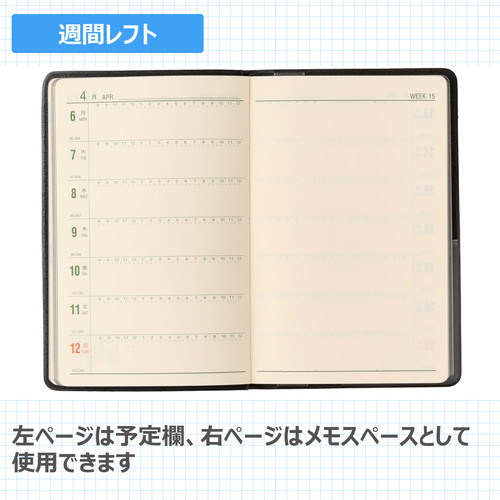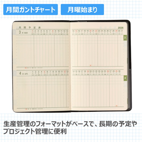 1つ1つ丁寧に職人の手によって生み出される手帳は多くのファンに愛されています。 【月間ページ】生産管理のフォーマットがベースのガントチャートタイプ。長期の予定やプロジェクト管理にも便利です。 【週間ページ】見開き1週間で左ページに予定、右ページはメモスペースとして使えるレフトタイプ(月曜始まり)。予定とメモにバランスの良い手帳です。 日本鉄道地図付き。