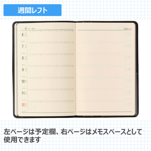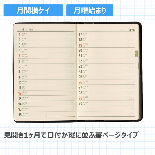 1つ1つ丁寧に職人の手によって生み出される手帳は多くのファンに愛されています。 【月間ページ】日付が縦に並ぶ罫ページタイプのレイアウト。長期の予定やプロジェクト管理にも便利です。 【週間ページ】見開き1週間で左ページに予定、右ページはメモスペースとして使えるレフトタイプ(月曜始まり)。予定とメモにバランスの良い手帳です。