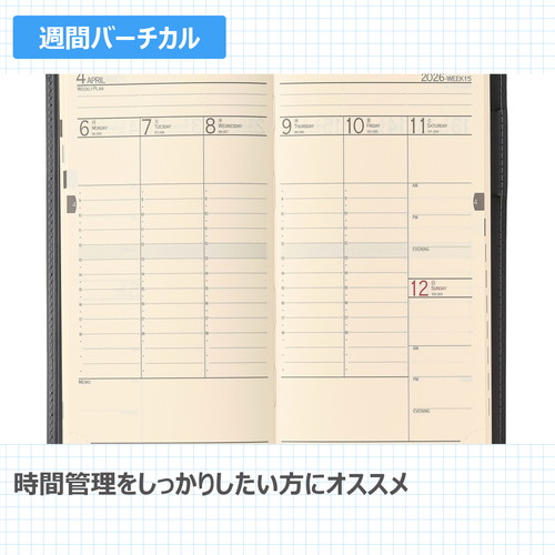 週間ページ下部の両角に切り取りミシンがあり、しおり代わりに使えて検索性も抜群。 【月間ページ】見開き1ヶ月のベーシックなブロックタイプ(月曜始まり)。 【週間ページ】見開き1週間で、月曜~金曜を中心に時間軸を配置したバーチカルタイプ。 モデルチェンジ:・裏表紙のNOLTYのロゴマークを廃止し、より多くの人が使いやすいシンプルなデザインに変更しました。