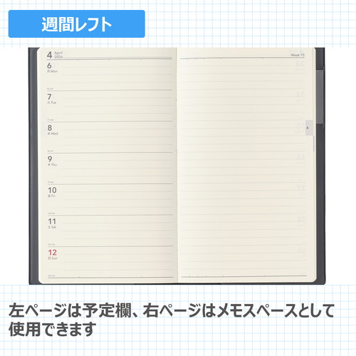 学生にも社会人にも、仕事にも趣味にも使いやすいNOLTY(ノルティ)のシンプルウィークリー手帳 【月間ページ】見開き1ヶ月のベーシックなブロックタイプ(月曜始まり)。 【週間ページ】見開き1週間のレフトタイプ(月曜始まり)。予定とメモにバランスよく使えるので、初心者にもおすすめのレイアウトです。 モデルチェンジ:・裏表紙のNOLTYのロゴマークを廃止し、より多くの人が使いやすいシンプルなデザインに変更しました。