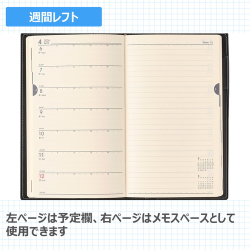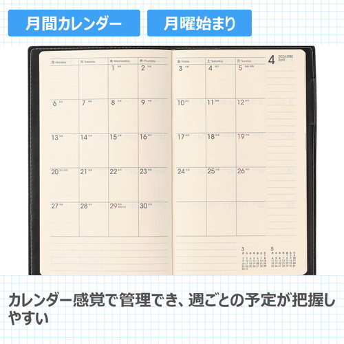 新書版サイズのNOLTY(ノルティ)ビジネス手帳 【月間ページ】見開き1ヶ月のベーシックなブロックタイプ(月曜始まり)。 【週間ページ】見開き1週間のレフトタイプ(月曜始まり)。予定とメモにバランスよく使えるので、初心者にもおすすめのレイアウトです。 モデルチェンジ:・裏表紙のNOLTYのロゴマークを廃止し、より多くの人が使いやすいシンプルなデザインに変更しました。