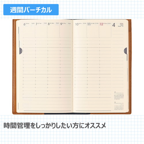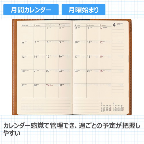 新書版サイズのNOLTY(ノルティ)ビジネス手帳 【月間ページ】見開き1ヶ月のベーシックなブロックタイプ(月曜始まり)。 【週間ページ】見開き1週間で全面に時間軸を配置したバーチカルタイプ。土日にも時間軸が入っているので、平日・週末問わず時間管理をしたい方におすすめです。 モデルチェンジ:・裏表紙のNOLTYのロゴマークを廃止し、より多くの人が使いやすいシンプルなデザインに変更しました。