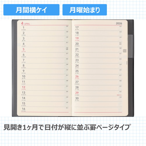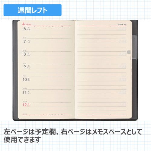 仕事におすすめのNOLTY(ノルティ)のロングセラービジネス手帳 【月間ページ】日付が縦に並ぶ罫ページタイプのレイアウト。長期の予定やプロジェクト管理に便利です。 【週間ページ】見開き1週間のレフトタイプ(月曜始まり)。予定とメモにバランスよく使えるので、初心者にもおすすめのレイアウトです。 モデルチェンジ:・裏表紙のNOLTYのロゴマークを廃止し、より多くの人が使いやすいシンプルなデザインに変更しました。 ・文字が見やすくなりました ・製本を変更し開きやすくなりました