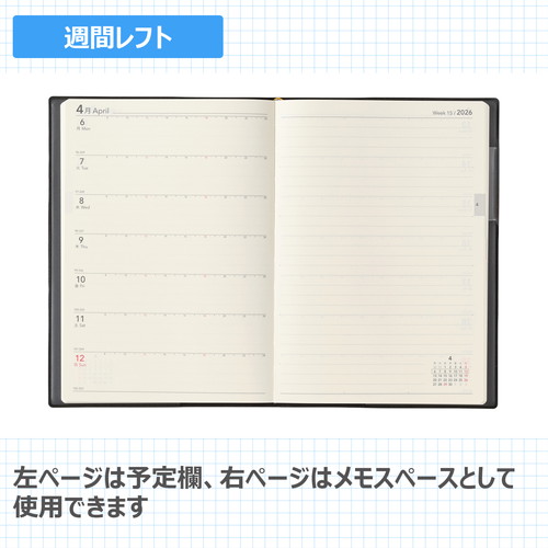 NOLTY(ノルティ)ブランド売上1位のウィークリー手帳シリーズ※日本能率協会マネジメントセンター24年度版EC販売数 無駄のないすっきりとしたデザインで、土日に薄く色をつけるなど機能性も抜群です。 【月間ページ】見開き1ヶ月のベーシックなブロックタイプ(月曜始まり)。カレンダーと同じような感覚で見ることができ、週ごとの予定が把握しやすいのが特徴です。 【週間ページ】見開き1週間で左ページに予定、右ページはメモスペースとして使えるレフトタイプ(月曜始まり)。予定とメモにバランスの良い手帳です。 モデルチェンジ:・裏表紙のNOLTYのロゴマークを廃止し、より多くの人が使いやすいシンプルなデザインに変更しました。