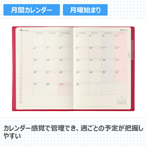NOLTY(ノルティ)ブランド売上1位のウィークリー手帳シリーズ※日本能率協会マネジメントセンター24年度版EC販売数 無駄のないすっきりとしたデザインで、土日に薄く色をつけるなど機能性も抜群です。 【月間ページ】見開き1ヶ月のベーシックなブロックタイプ(月曜始まり)。カレンダーと同じような感覚で見ることができ、週ごとの予定が把握しやすいのが特徴です。 【週間ページ】見開き1週間で左ページに予定、右ページはメモスペースとして使えるレフトタイプ(月曜始まり)。予定とメモにバランスの良い手帳です。 モデルチェンジ:・裏表紙のNOLTYのロゴマークを廃止し、より多くの人が使いやすいシンプルなデザインに変更しました。