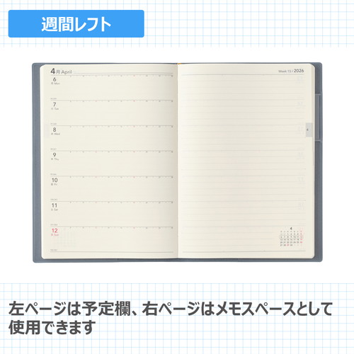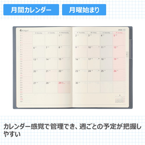 NOLTY(ノルティ)ブランド売上1位のウィークリー手帳シリーズ※日本能率協会マネジメントセンター24年度版EC販売数 無駄のないすっきりとしたデザインで、土日に薄く色をつけるなど機能性も抜群です。 【月間ページ】見開き1ヶ月のベーシックなブロックタイプ(月曜始まり)。カレンダーと同じような感覚で見ることができ、週ごとの予定が把握しやすいのが特徴です。 【週間ページ】見開き1週間で左ページに予定、右ページはメモスペースとして使えるレフトタイプ(月曜始まり)。予定とメモにバランスの良い手帳です。 モデルチェンジ:・裏表紙のNOLTYのロゴマークを廃止し、より多くの人が使いやすいシンプルなデザインに変更しました。