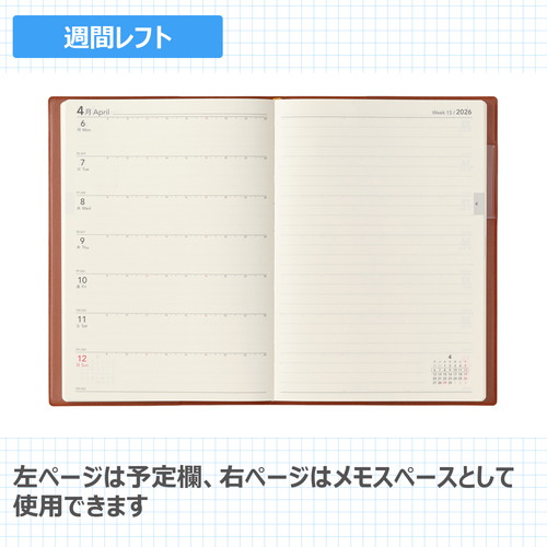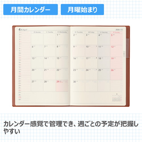 NOLTY(ノルティ)ブランド売上1位のウィークリー手帳シリーズ※日本能率協会マネジメントセンター24年度版EC販売数 無駄のないすっきりとしたデザインで、土日に薄く色をつけるなど機能性も抜群です。 【月間ページ】見開き1ヶ月のベーシックなブロックタイプ(月曜始まり)。カレンダーと同じような感覚で見ることができ、週ごとの予定が把握しやすいのが特徴です。 【週間ページ】見開き1週間で左ページに予定、右ページはメモスペースとして使えるレフトタイプ(月曜始まり)。予定とメモにバランスの良い手帳です。 モデルチェンジ:・裏表紙のNOLTYのロゴマークを廃止し、より多くの人が使いやすいシンプルなデザインに変更しました。 ※表紙を変更しました