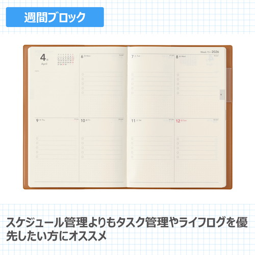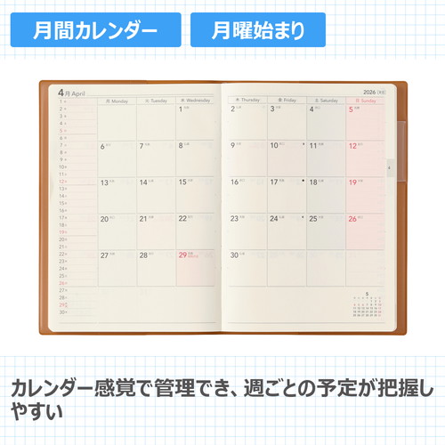NOLTY(ノルティ)ブランド売上1位のウィークリー手帳シリーズ※日本能率協会マネジメントセンター24年度版EC販売数 無駄のないすっきりとしたデザインで、土日に薄く色をつけるなど機能性も抜群です。 【月間ページ】見開き1ヶ月のベーシックなブロックタイプ(月曜始まり)。カレンダーと同じような感覚で見ることができ、週ごとの予定が把握しやすいのが特徴です。 【週間ページ】見開き1週間でブロック型に分かれているタイプ。ブロックの上部にはタスク管理、下部にはメモ等が書けるフリースペースと、用途に合わせて書き分けられます。 モデルチェンジ:・裏表紙のNOLTYのロゴマークを廃止し、より多くの人が使いやすいシンプルなデザインに変更しました。