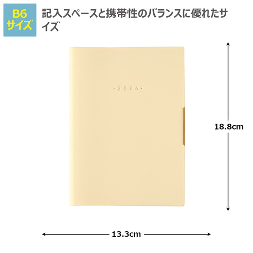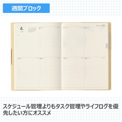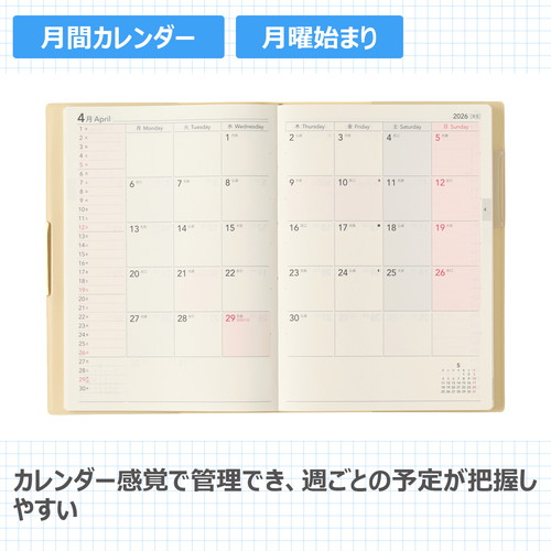 プランとログページが充実のNOLTY(ノルティ)のおすすめ手帳「エクリPlusB6」 人気のエクリB6手帳の機能はそのままに巻末ページを16ページ追加しています。 巻末には1年を大切に過ごせるような様々な記録フォーマットを用意しました。 表紙はシンプルながらも上品な色合い、あしらいで華やかさをプラスしました。 【月間ページ】見開き1ヶ月のベーシックなブロックタイプ(月曜始まり)。カレンダーと同じような感覚で見ることができ、週ごとの予定が把握しやすいのが特徴です。 【週間ページ】見開き1週間でブロック型に分かれているタイプ。 ブロックの上部にはタスク管理、下部にはメモ等が書けるフリースペースと、用途に合わせて書き分けられます。 モデルチェンジ:・裏表紙のNOLTYのロゴマークを廃止し、より多くの人が使いやすいシンプルなデザインに変更しました。 ※表紙を変更しました