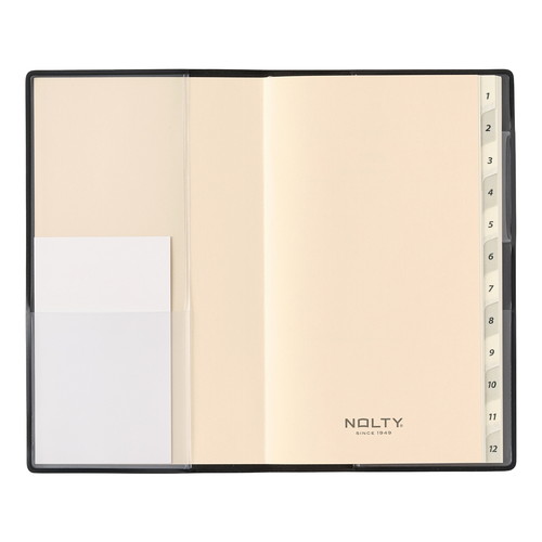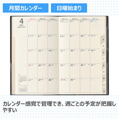NOLTY(ノルティ)のシンプルマンスリー手帳、インデックス付きタイプ。 いつでも持ち運べて予定管理をしやすいおすすめのスケジュール帳です。 【月間ページ】見開き1ヵ月のベーシックなブロックタイプ(日曜始まり)。カレンダー感覚で月ごとの予定が把握できます。