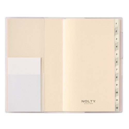 NOLTY(ノルティ)のシンプルマンスリー手帳、インデックス付きタイプ。 いつでも持ち運べて予定管理をしやすいおすすめのスケジュール帳です。 【月間ページ】見開き1ヵ月のベーシックなブロックタイプ(日曜始まり)。カレンダー感覚で月ごとの予定が把握できます。