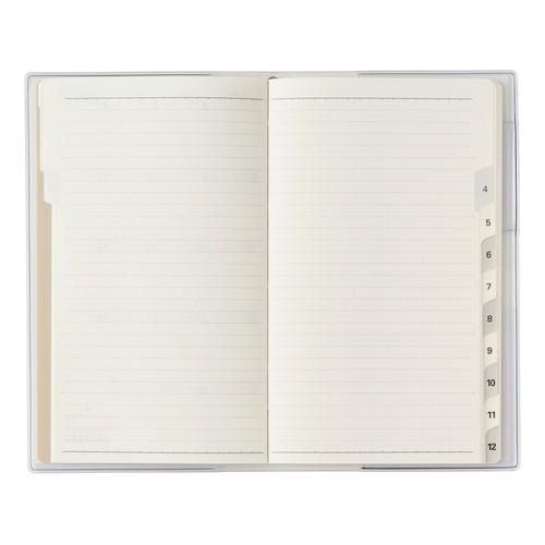 NOLTY(ノルティ)のマンスリースリム-iアイダにメモ手帳は、各月のアイダにメモページと方眼ページが2ページずつ付いているのが特長です。 【月間ページ】見開き1ヵ月のベーシックなブロックタイプ(日曜始まり)。各月ごとに罫ページと方眼ページが付いているので、その月のできごとをメモするのに便利。 見たいページをパッと開けるインデックス付きです。