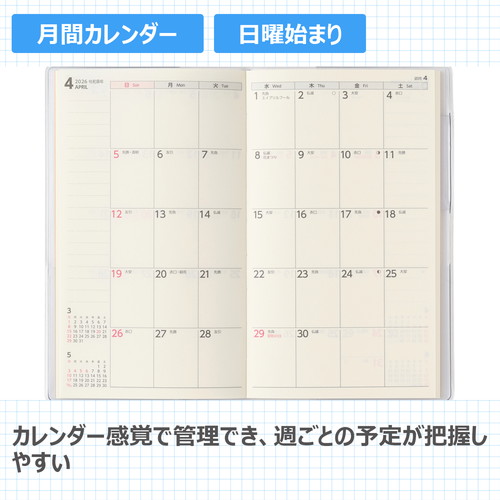 NOLTY(ノルティ)のカラーバリエーション豊富なシンプルマンスリー手帳。 いつでも持ち運べて予定管理をしやすいおすすめのスケジュール帳です。 【月間ページ】見開き1ヵ月のベーシックなブロックタイプ(日曜始まり)。カレンダーと同じような感覚で見ることができ、月ごとの予定が把握しやすいのが特長です。