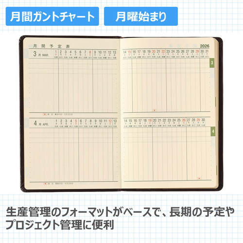 表紙素材はインド産の羊革(ヤンピー)を使用。柔らかく、手に馴染みやすいのでしなやかに手帳が開けます。 用紙はこの手帳のためだけにつくられた手帳専用用紙を使用。 小口に施された本金箔など、手帳を使う喜びをお愉しみいただける逸品です。 【月間ページ】生産管理のフォーマットがベースのガントチャートタイプ。長期の予定やプロジェクト管理にも便利です。 【週間ページ】見開き1週間のレフトタイプ(月曜始まり)。 天然素材を使用しているため、本革の商品は個体差がございます。何卒ご了承ください。 NOLTY 能率手帳ゴールドをご購入いただくと、商品に同封のご案内より「NOLTY 能率手帳GOLD MEMBERS CLUB」へのご登録が可能となります。 「NOLTY 能率手帳GOLD MEMBERS CLUB」は会員限定オリジナル商品のご紹介などの会員特典をご用意しております。