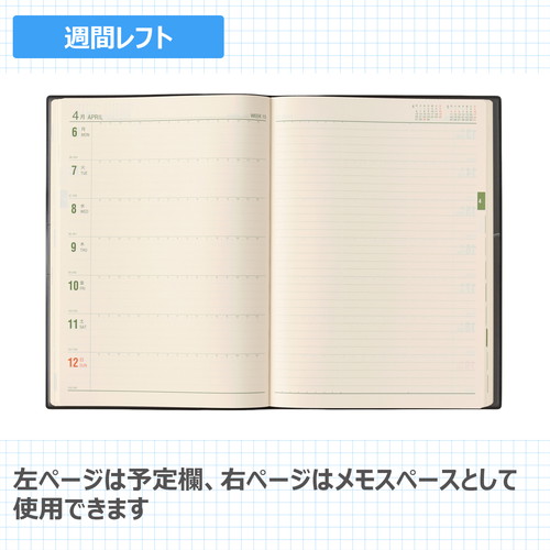メモページがノート1冊分以上あり、手帳とノートを一括管理したい人におすすめの能率手帳。 【月間ページ】見開き2ヶ月で日付が横に並ぶガントチャートタイプのレイアウト。長期の予定やプロジェクト管理に便利です。 【週間ページ】見開き1週間で左ページに予定、右ページはメモスペースとして使えるレフトタイプ(月曜始まり)。予定とメモにバランスの良い手帳です。