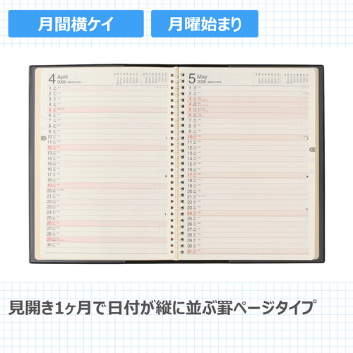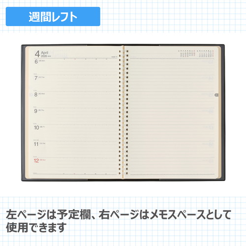 平らに開いて書きやすいNOLTY(ノルティ)のリング式ウィークリー手帳 【月間ページ】見開き2ヶ月で日付が縦に並ぶ罫ページタイプのレイアウト。長期の予定やプロジェクト管理に便利です。 【週間ページ】見開き1週間のレフトタイプ(月曜始まり)。予定とメモにバランスの良い手帳です。