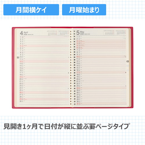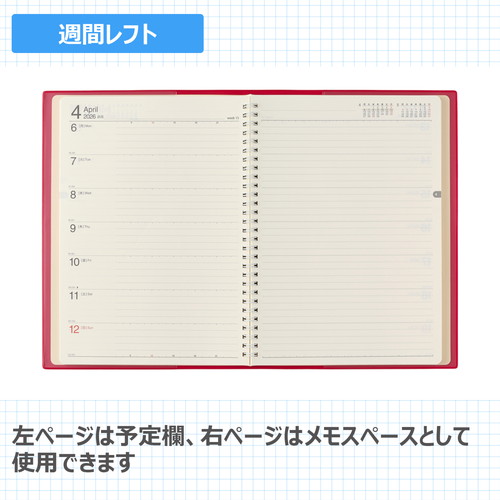 平らに開いて書きやすいNOLTY(ノルティ)のリング式ウィークリー手帳 【月間ページ】見開き2ヶ月で日付が縦に並ぶ罫ページタイプのレイアウト。長期の予定やプロジェクト管理に便利です。 【週間ページ】見開き1週間のレフトタイプ(月曜始まり)。予定とメモにバランスの良い手帳です。