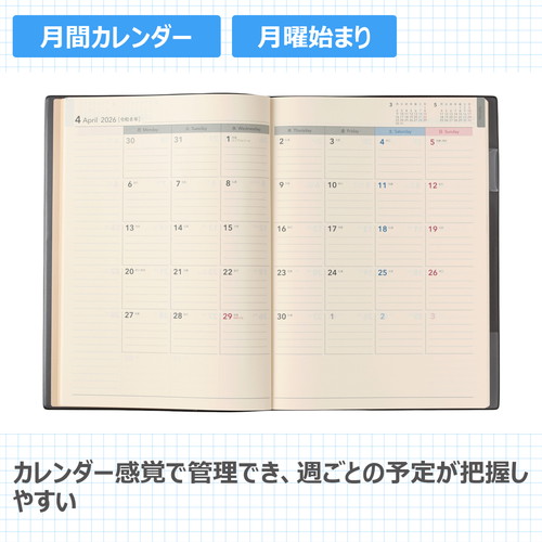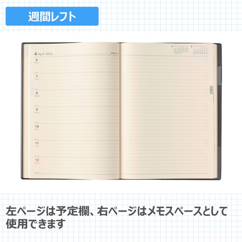 NOLTY(ノルティ)ブランド売上1位のウィークリー手帳シリーズ※日本能率協会マネジメントセンター24年度版EC販売数 ノート1冊分のメモページがついていて、手帳とノートを1冊にまとめたい方におすすめです。デイリーの記入スペースには罫線が入っているので、文字がきれいに記入できます。 【月間ページ】見開き1ヶ月のベーシックなブロックタイプ(月曜始まり)。カレンダーと同じような感覚で見ることができ、週ごとの予定が把握しやすいのが特徴です。 【週間ページ】見開き1週間のレフトタイプ(月曜始まり)。予定とメモにバランスの良い手帳です。