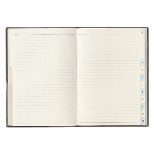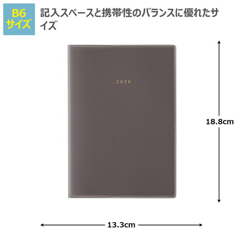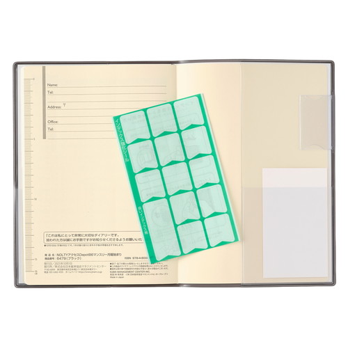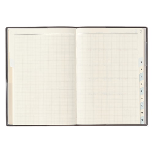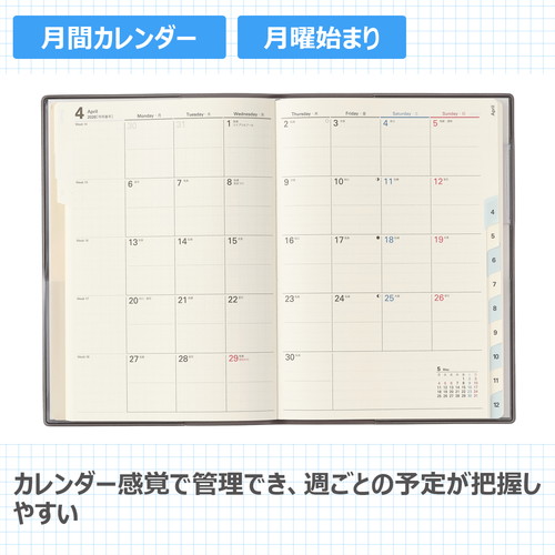 「薄くてもたくさん書ける」ということを追求したカレンダー+メモタイプのダイアリーです。1日の1マスを最大限に大きくし、月と月の間には充実のメモ4ページ。 【月間ページ】見開き1ヶ月のベーシックなブロックタイプ(月曜始まり)。カレンダーと同じような感覚で見ることができ、週ごとの予定が把握しやすいのが特徴です。 見たいページをパッと開けるインデックス付きです。 ※表紙を変更しました