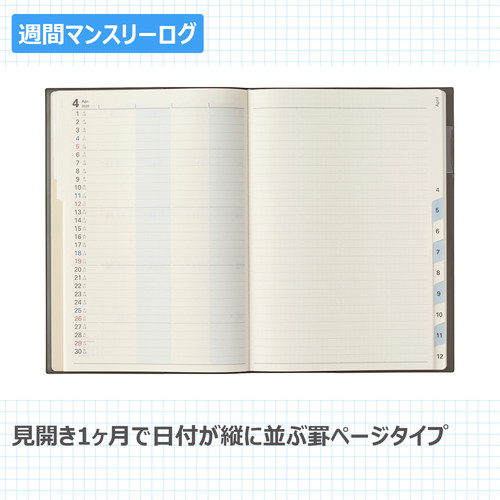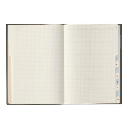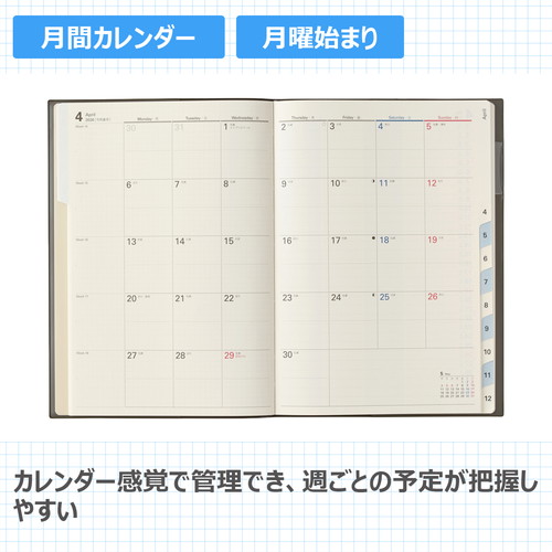 複数のプロジェクトや案件の管理をしたい社会人にもおすすすめのNOLTY(ノルティ)の人気手帳。月間カレンダー+月間横ケイ+方眼メモページの薄型手帳 【月間カレンダー】見開き1ヶ月のベーシックなブロックタイプ(月曜始まり)。カレンダーと同じような感覚で見ることができ、週ごとの予定が把握しやすいのが特徴です。 【月間横ケイ】左ページは項目別に上から下の流れに沿って1ヶ月を俯瞰して把握できるマルチプランページ。右ページはノート代わりにしたり、上下のドットをガイドに縦に腺を引けば、左ページ同様に使え、最大8つの進行管理が可能です。