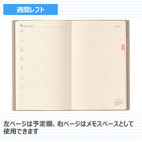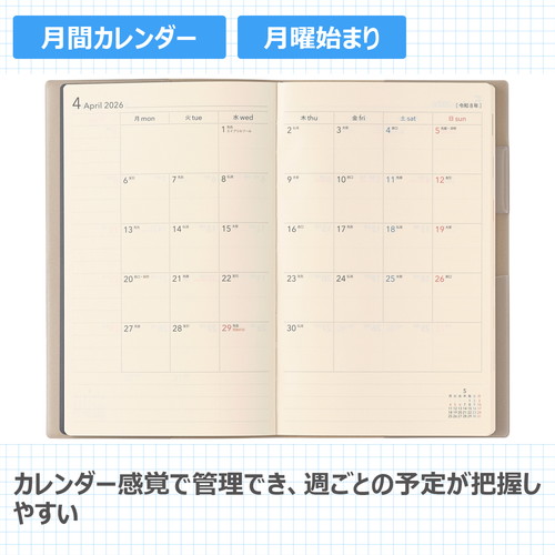 コンパクトなボディと「スケジュールライン」で立体的なスケジューリングができる機能的かつ持っていて楽しくなるウィークリーダイアリー。ラインが薄くドットなので目にも優しい手帳です。 【月間ページ】見開き1ヶ月のベーシックなブロックタイプ(月曜始まり)。カレンダーと同じような感覚で見ることができ、週ごとの予定が把握しやすいのが特徴です。 【週間ページ】見開き1週間のレフトタイプ(月曜始まり)。予定とメモにバランスの良い手帳です。 モデルチェンジ:・裏表紙のNOLTYのロゴマークを廃止し、より多くの人が使いやすいシンプルなデザインに変更しました。 ※表紙を変更しました