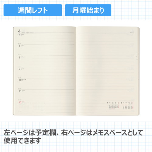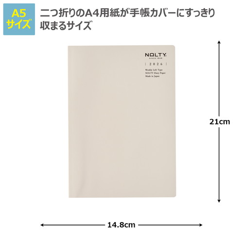 予定もタスクもメモもアイデアも。専用手帳カバーにダイアリーとノートをまとめて収納できるNOLTY(ノルティ)のTiO(ティオ)シリーズ ティオはノートタイプの手帳となります。(汚れや水に強いPP加工を採用した紙の表紙の手帳です) ■自分らしくカスタマイズ■ さまざまな組み合わせができるシンプルなダイアリーとノート、カバーをご用意しました。セットして使うことでシーンや気分に合わせ自分らしく使えます。 ■組み合わせでも単独でも■ 使いやすさを第一に。ダイアリーもノートも細部までこだわり抜いて設計しました。 ダイアリーの表紙は、汚れや水に強いPP加工を採用。カバーと組み合わせても、手帳単独でもご使用頂けます。 レフトタイプはノートとの組み合わせはもちろん、マンスリータイプと組み合わせても便利に使えます。 モデルチェンジ:・印刷インデックスが入りました