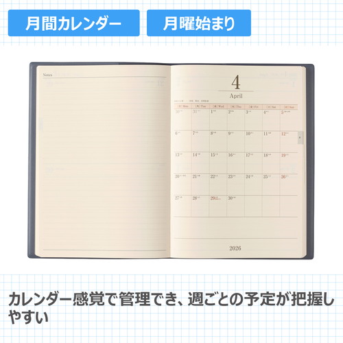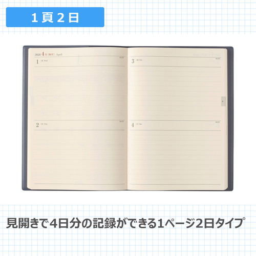 たくさん書きたいという方におすすめのNOLTY(ノルティ)の日記帳。日付入りメモ帳としても活用できます。 【月間ページ】1ヶ月のベーシックなブロックタイプ(月曜始まり)。カレンダーと同じような感覚で見ることができ、週ごとの予定が把握しやすいのが特徴です。 【日記欄】見開きで4日分の記録ができる1頁2日タイプ。日記や業務日誌など、1日の記録をたっぷり記入したい人におすすめのレイアウトです。