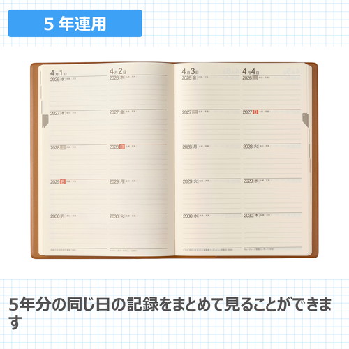 経年での記録を残せる振り返りに便利なダイアリー 5年連用日誌 日記としての記入はもちろん、業務日誌として利用すれば振り返りや業務計画を立てる際に役立ちます。経年で記録を残したい方におすすめのNOLTY(ノルティ)日記帳。 【月間ページ】見開き1ヶ月で日付が縦に並ぶ罫ページタイプのレイアウト。 【日記欄】5年分の同じ日の記録を一覧できる5年連用タイプ。日記や業務日誌、育児日記などにおすすめのレイアウトです。 ※表紙を変更しました